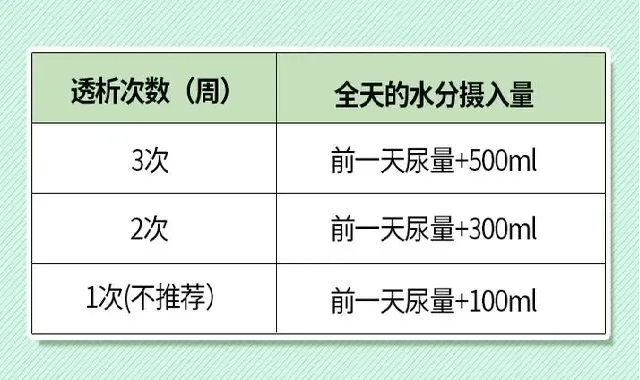 每天摄入水量应包括每日饮水量、食物或药物含水量、体内新陈代谢产生的内生水量、住院时的输液量。透析病人能喝多少水取决于残余肾功能。每周透析三次的患者,饮水量是前一日尿量加500ml。每周透析两次的患者,饮水量是前一日尿量加300ml。每周透析一次的患者,饮水量是前一日尿量加100ml。透析次数越多,饮水量可适量增加。不过对于无尿的病人,应限制液体摄取。