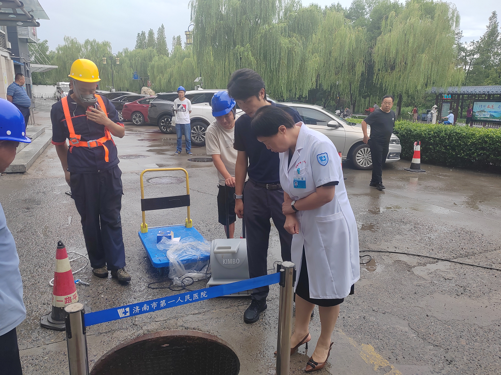 为落实省政府安委会《进一步强化有限空间作业安全整治严防中毒窒息事故专项行动方案》的通知精神,全面做好医院有限空间作业工作,进一步提高医院突发作业事故快速反应和应急救援能力, 2025年7月22日上午,济南市第一人民医院组织开展了有限空间作业应急演练。本次演练由总务部、急诊医学科、污水站运营单位等工作人员参加,医院安全总监、副院长李蕊现场指挥。