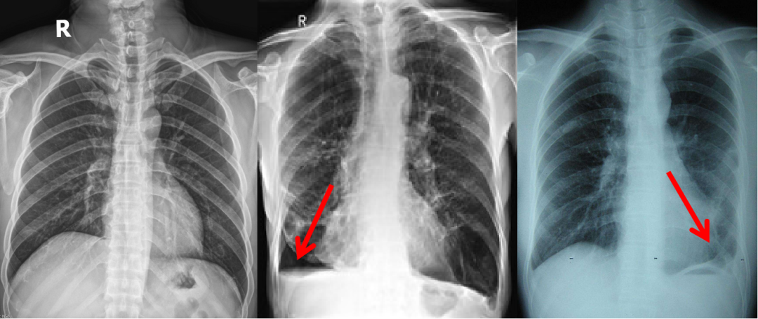 左图正常,双侧肋膈角锐利;中图右侧肋膈角变钝,少量胸腔积液;右图左侧胸膜粘连,肋膈角消失。