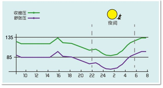 我们的血压是24小时都在变化的,大多数人24小时的血压变化遵循着医学上称之为“双峰一谷”的杓型血压节律,即随早晨起床而逐渐上升,一般在早晨6点-10点时段血压最高,并且一直维持相对较高水平直到傍晚,随后傍晚的血压逐渐下降,在晚上睡觉时降到最低,夜间凌晨1点-3点是血压低谷,清晨血压略升高是一种正常的生理状态。