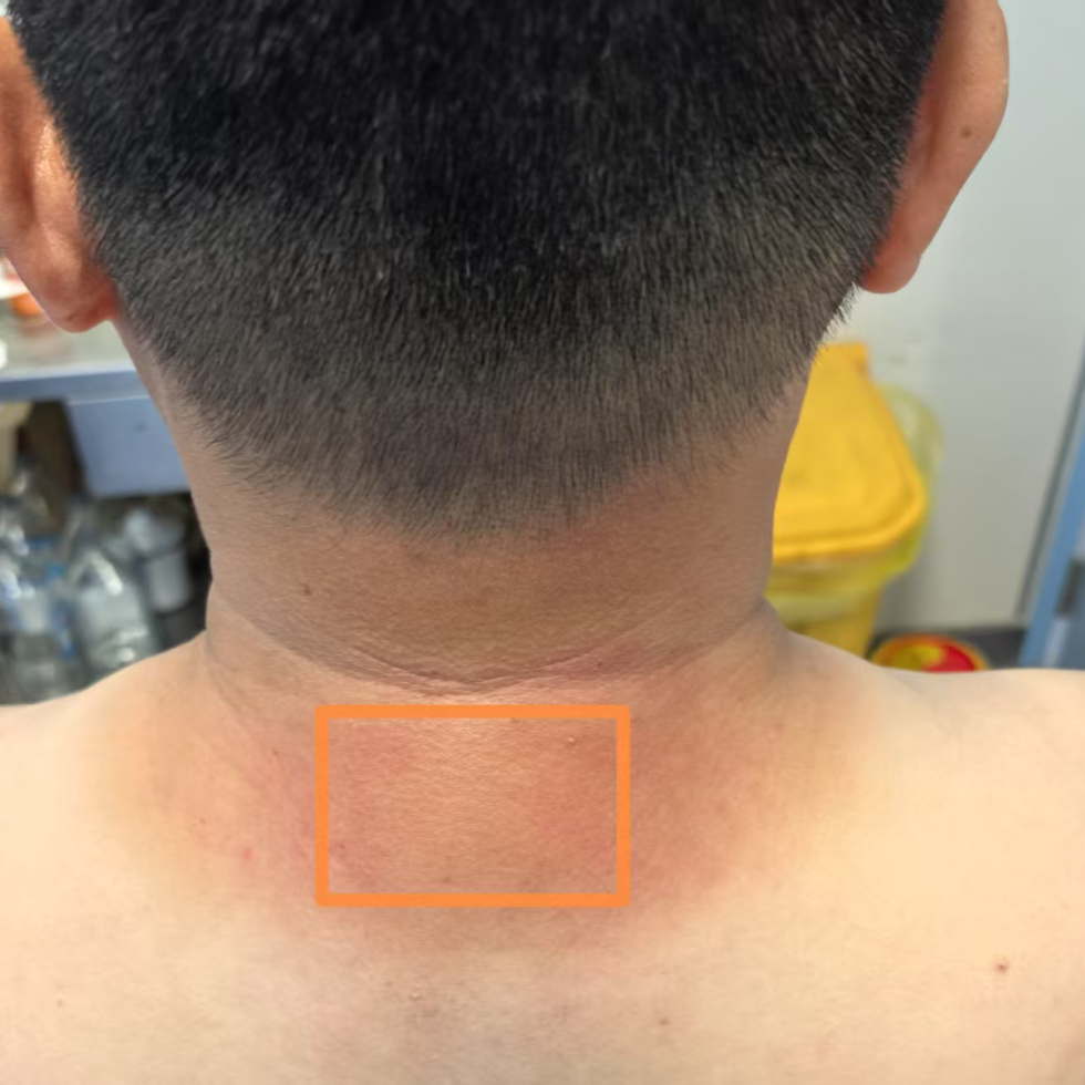 案例2:胡先生,颈椎富贵包伴手麻,经4次埋线治疗后包块软化,体积缩小50%,疼痛消失,体态明显改善。