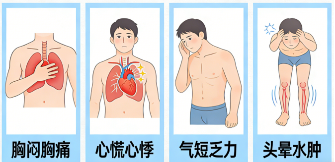 稍微活动一下就气喘吁吁,甚至休息时也觉得呼吸困难。同时,由于心脏泵血功能下降,全身供血不足,人会感到异常疲劳,即使充分休息也无法缓解。
