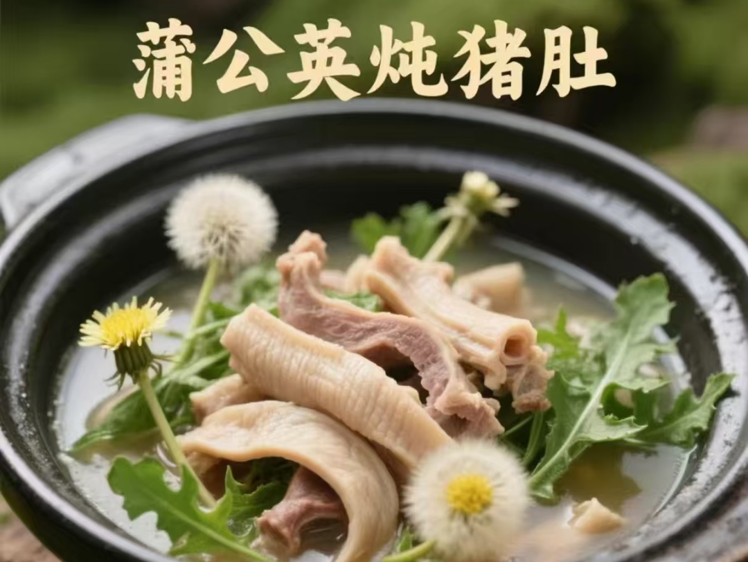 蒲公英炖猪肚:猪肚1个,洗净后开水焯一下去腥味,切块再煮,快熟的时候加30克蒲公英,再煮10分钟,放少许盐和胡椒粉调味,分2~4次吃肉喝汤。