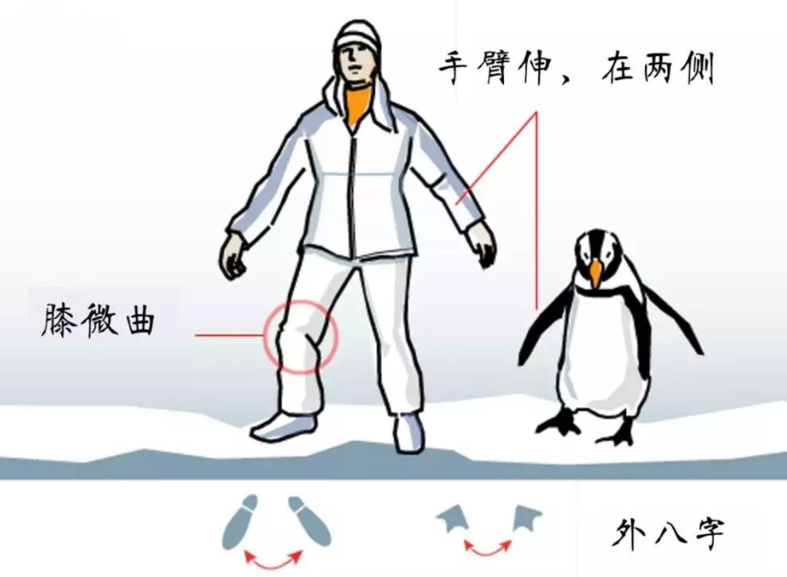企鹅步:模仿企鹅走路,身体微微前倾,双脚稍向外分开(与肩同宽),小步蹭着走,重心落在前脚。