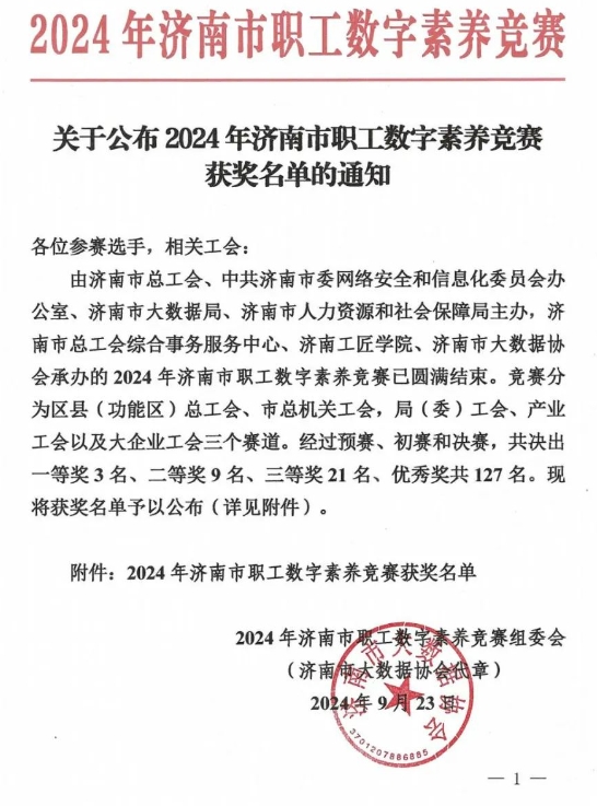 9月21日上午,由济南市总工会、中共济南市委网络安全和信息化委员会办公室、济南市大数据局、济南市人力资源和社会保障局联合主办,济南市总工会综合事务服务中心、济南工匠学院、济南市大数据协会承办的“2024年济南市职工数字素养竞赛”在济南工匠学院举办。济南市第一人民医院信息部崔磊经过网上预赛的选拔,参加了此次的现场初赛和决赛,经过激烈的角逐,成功荣获三等奖的佳绩!
