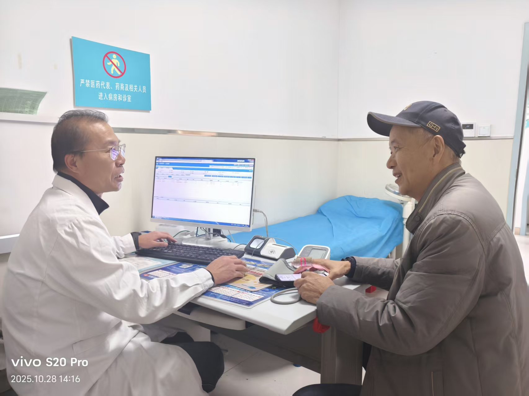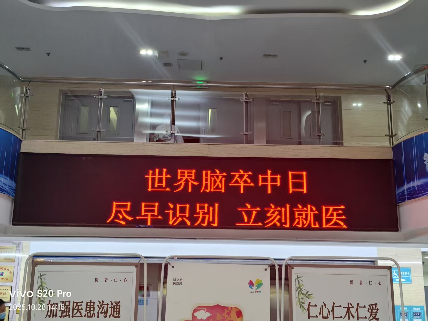 门诊大厅大屏上“尽早识别 立刻就医”的宣传主题格外醒目,时刻提醒着居民关注脑卒中这一健康“杀手”。