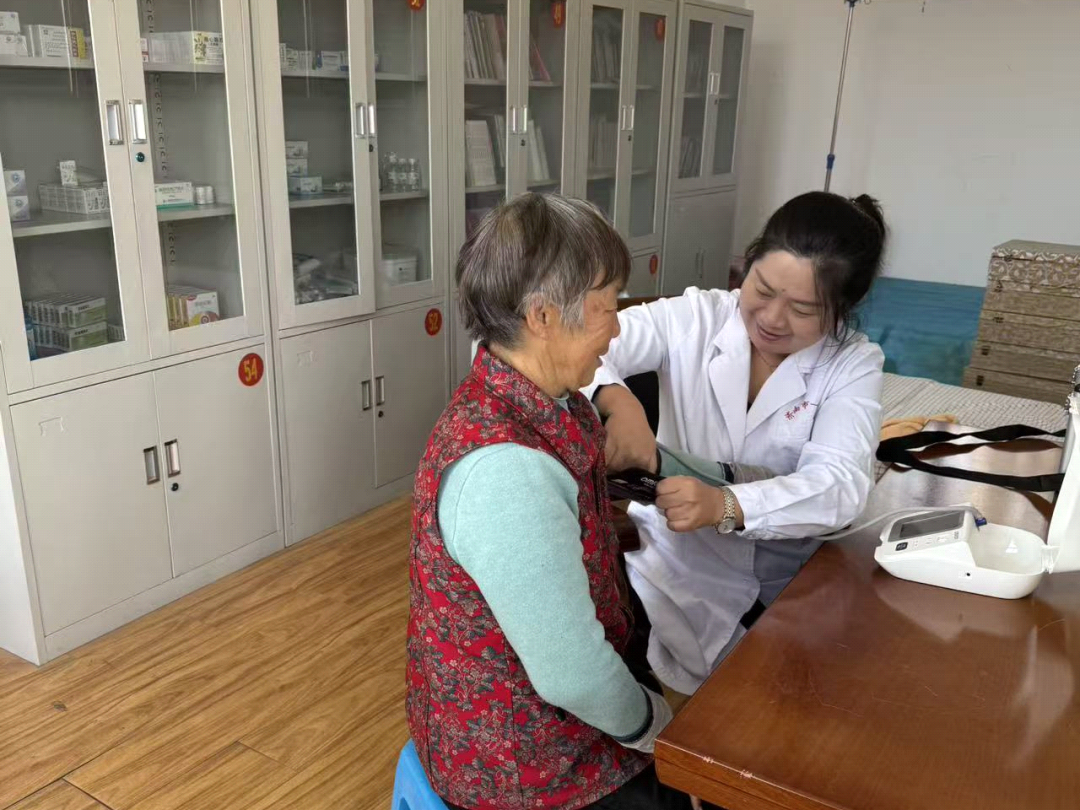 走访中她还了解到210户村民中65岁以上老人就有130人,高血压、糖尿病患者占了近六分之一,2021年村医离世后,医疗空白成了村民最大的心病。看着村民们期盼的眼神,她当即决定利用自己的专业特长填补医疗空白。在单位大力的支持下,她申请多地点执业资格,利用村委一间办公室成立了,“第一书记诊室”,当年12月,诊室正式投入运行。医院无偿捐赠了心电图机、血压计、血糖仪等设备,还有价值近5000元的药品,涵盖高血压、糖尿病、冠心病等常见病用药,让村民“小病不出村”的愿望成为现实。