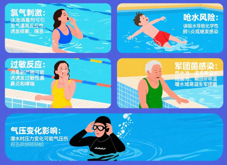 氯气刺激:泳池消毒剂可引发气道高反应性,诱发咳嗽、喘息