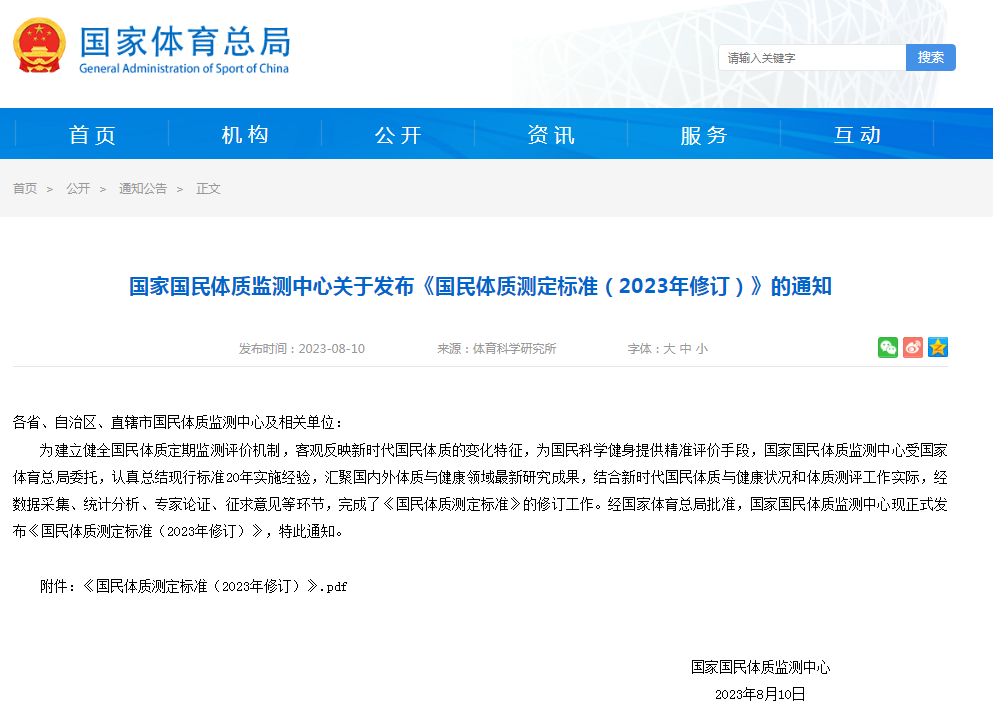 为建立健全国民体质定期监测评价机制,客观反映新时代国民体质的变化特征,为国民科学健身提供精准评价手段,经国家体育总局批准,国家国民体质监测中心于2023年8月正式发布《国家体质测定标准(2023年修订)》(以下简称《标准》)。该《标准》分幼儿部分、成年人部分、老年人部分进行体测划分。每个部分又分身体形态指标、身体素质指标(老年人部分加入身体机能指标),综合量化得分作为衡量各年龄段体质综合评级的标准,综合量化得分划分为优秀、良好、合格、不合格四个档次。可以看出,身体形态指标(分体重指数、体脂率两个次级指标) 权重仅占综合考量的15%或20%,更多权重放在身体素质指标(包括:力量、柔韧、平衡、耐力)的各项体能测试表现上。