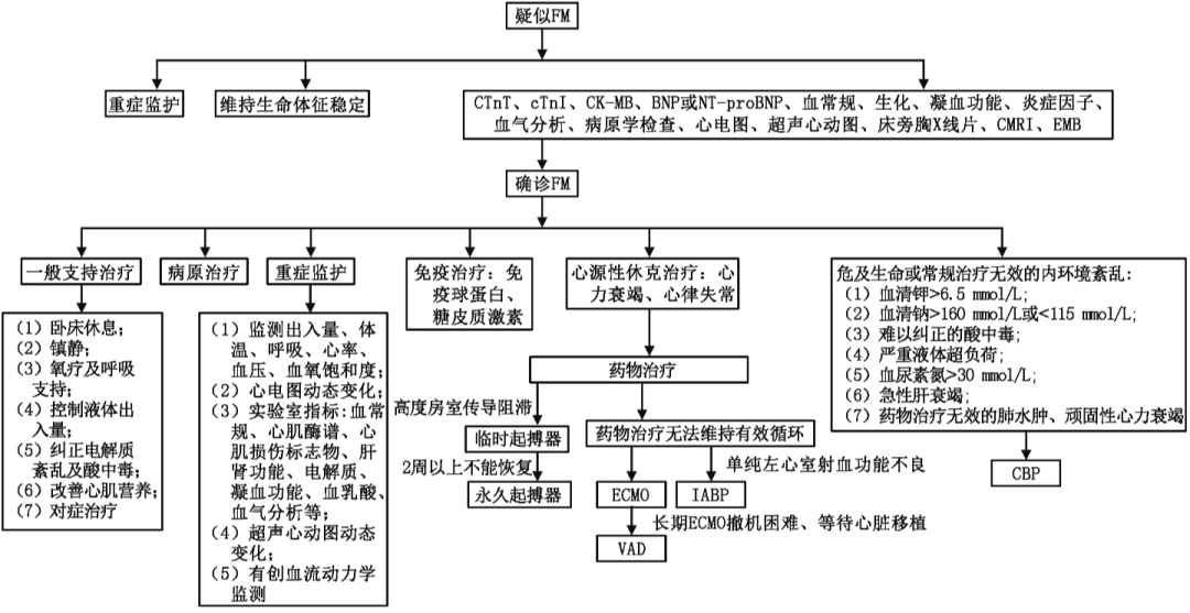 采取“以生命维持为基础的综合治疗”,机械循环支持治疗是中心环节,针对心源性休克、心力衰竭、心律失常等对症治疗,并进行病原治疗、免疫治疗。
