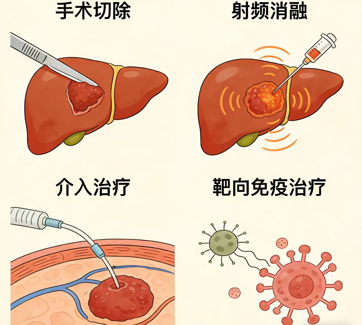 靶向治疗与免疫治疗:针对晚期肝癌患者,靶向药可精准攻击肿瘤细胞,免疫治疗能激活自身免疫系统对抗肿瘤。