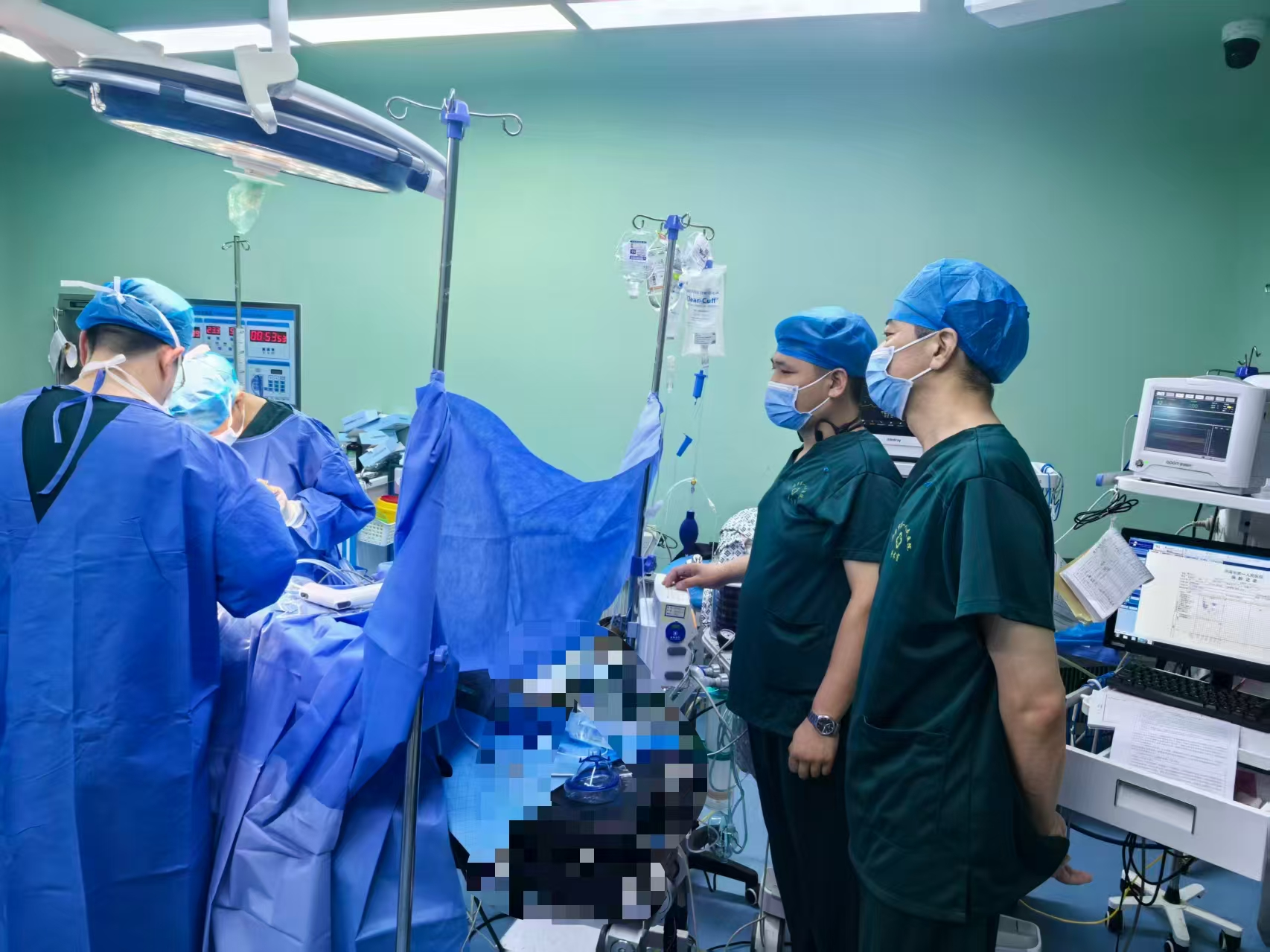 麻醉科柴永健主任高度重视,组织团队进行术前讨论与评估。结合心内科、呼吸科、骨科、ICU以及家属的意见。综合评估患者:患者体格瘦小,平时自理能力差,低钾、低钙等电解质紊乱,同时合并嗜睡、高血压及中度贫血(血红蛋白73g/l)机体功能衰退同时合并多种基础疾病和并发症,ASA分级Ⅳ级,麻醉风险极高,这无疑给手术麻醉带来了极大风险和挑战。但是老人及家属的强烈手术愿望,使得我们有责任和义务为患者驱除病痛。麻醉方案讨论后,考虑患者心肺功能较差伴谵妄,胸、腰椎压缩骨折,椎管内麻醉是禁忌,最终决定实施喉罩全身麻醉+超声引导下腰方肌阻滞的麻醉方案。该方案可以在保留患者自主呼吸的情况下,大大减少阿片类药物的应用,减少术后疼痛和谵妄,尽早促进病人围手术期康复。