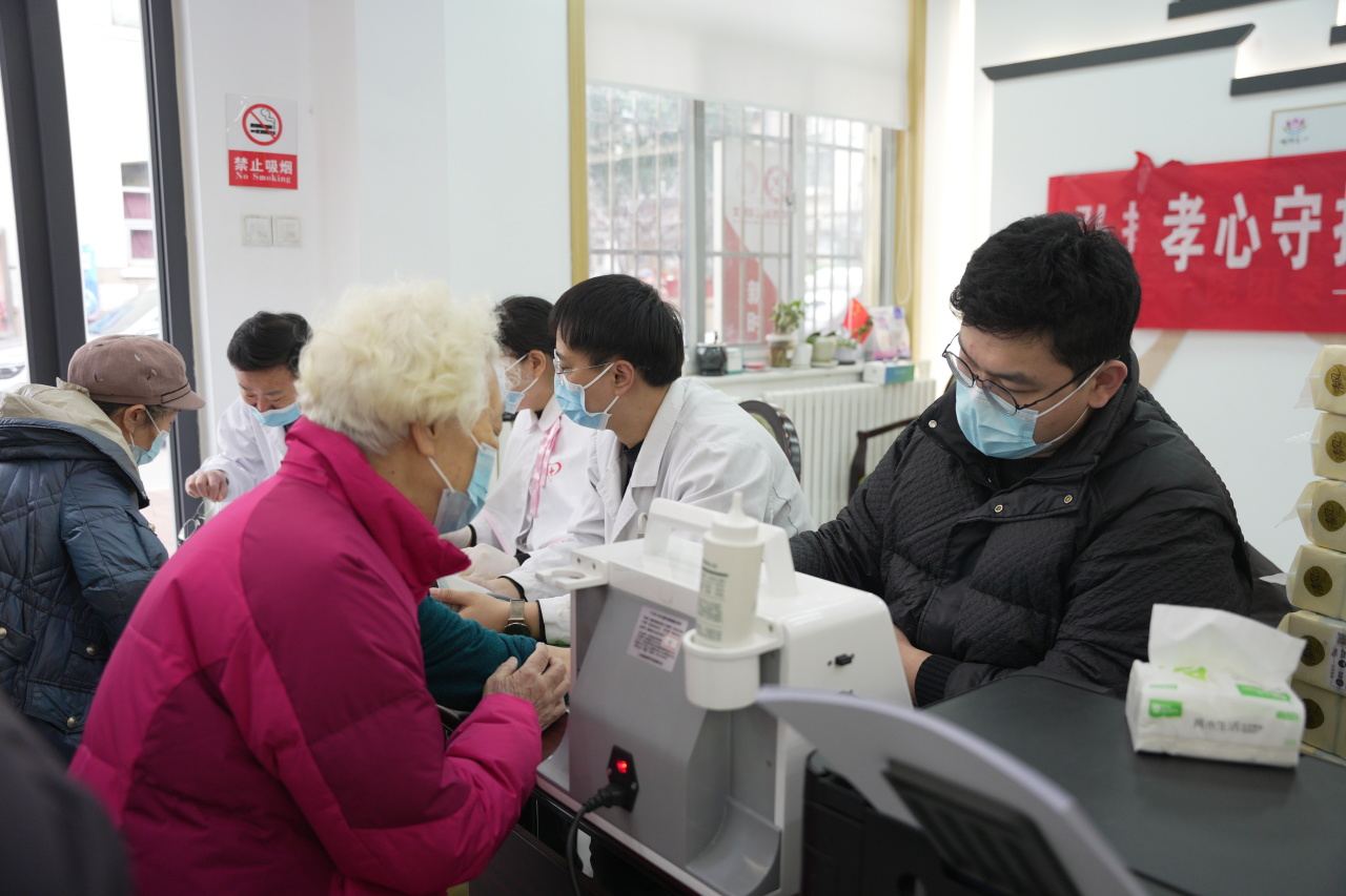 尽管天气微寒,但义诊现场气氛热烈,前来咨询和检查的居民络绎不绝。医务志愿者们为居民免费测量血压、血糖,并利用专业设备开展骨密度检测,帮助老年人及早发现骨质疏松等潜在健康风险,提供科学的生活方式和饮食调理建议。现场还提供了中医特色技术服务。中医老年医学科专家为有需要的居民免费压耳豆,通过中医适宜技术帮助缓解失眠、头痛等常见不适;同时,针对关节疼痛、腰肌劳损等问题,提供免费膏药贴敷服务,受到社区居民尤其是老年朋友的一致好评。