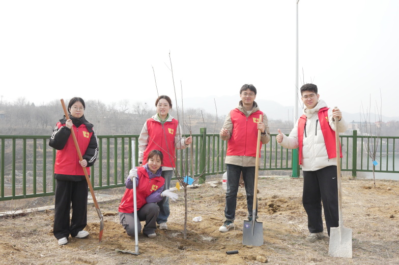 随着一声“出发植树”的号召,活动正式转入核心环节,气氛瞬间达到高潮。一棵棵充满生机的树苗拿在青年代表手中,每一株树苗都承载着对绿色未来的期许。为确保植树质量,济南市国有柳埠林场(柳埠市级自然保护区)党委委员、副主任李奎伟现场“传经送宝”,详细讲解了挖坑深度、扶苗角度、填土压实、浇水养护等技术要点:“树苗种植要做到‘三埋两踩一提苗’,这样才能保证成活率,让新苗真正扎根生长。”青年们听得认真、记得仔细,随后迅速分组行动,三人一组、五人一队,分工明确、配合默契。有的挥锹铲土,动作标准有力;有的扶苗定位,确保树干挺拔;有的提水浇灌,让清水浸润根系。新苗整齐排列、迎风挺立,为初春的南山增添了一片鲜活的新绿,也见证着医媒协作的丰硕成果。